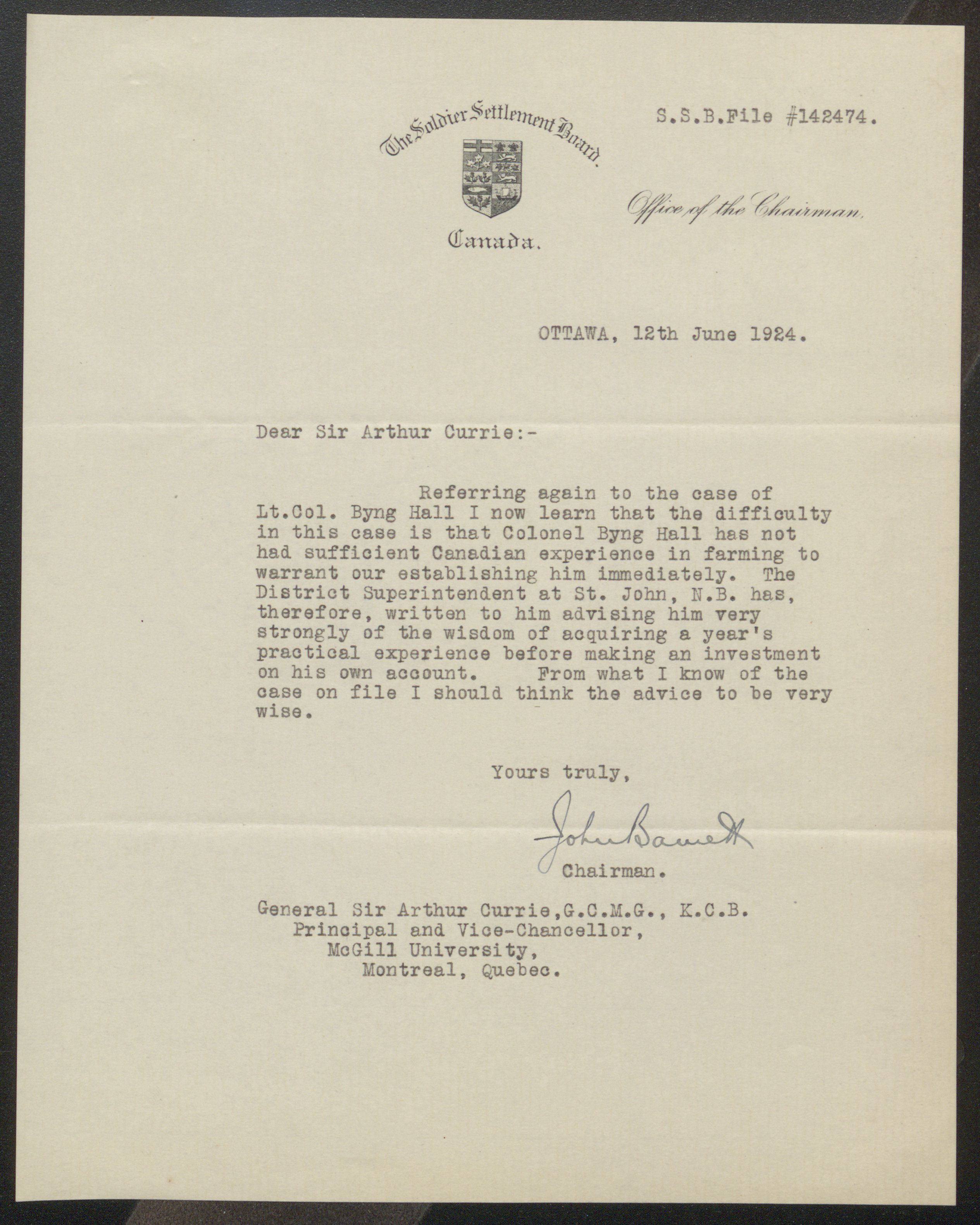 McGill University. Office of the Principal (RG2) : Sir Arthur Currie : Veterans Re-Establishment: A-C