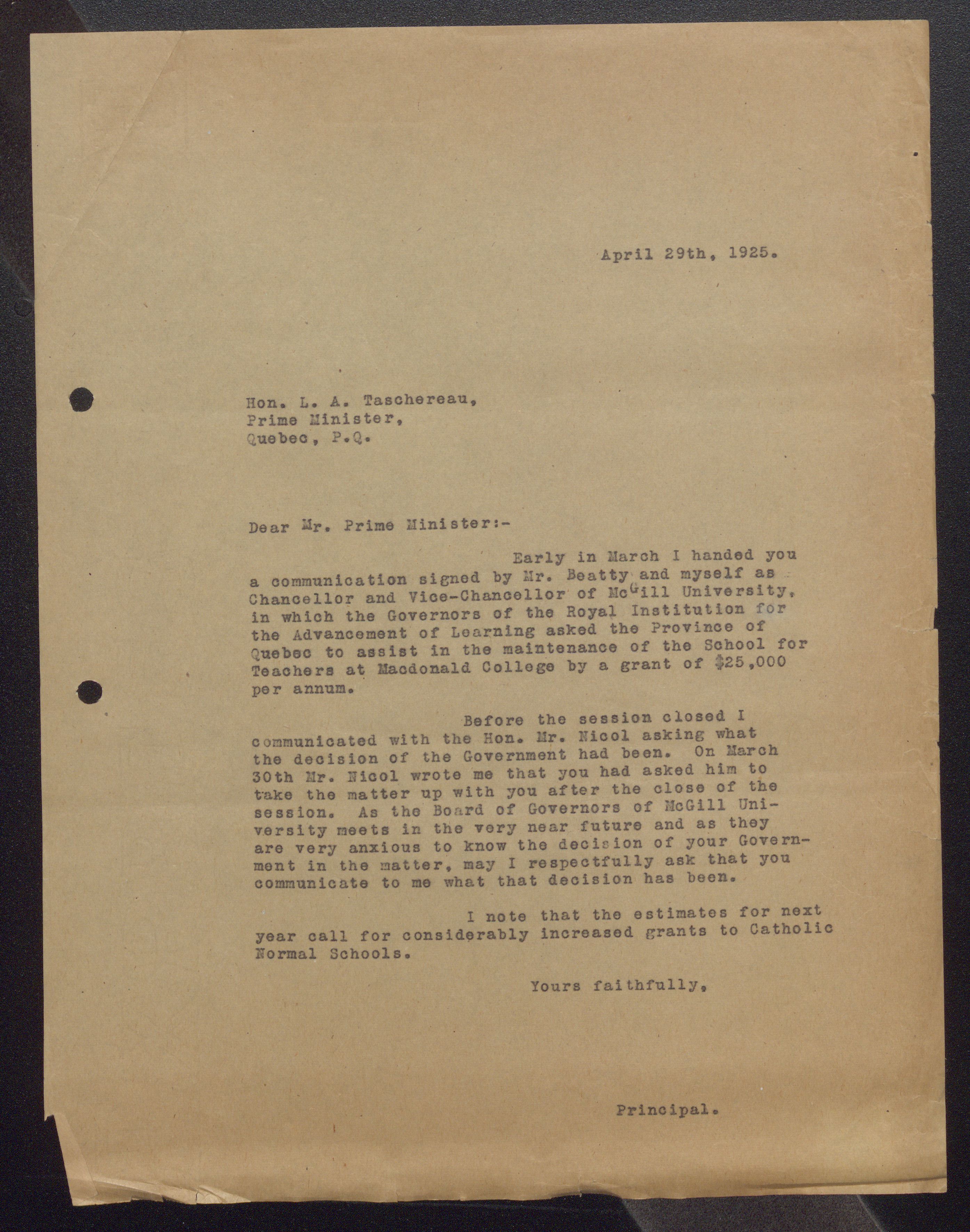 MacDonald College: Teachers; Finances and Provincial Government Grants